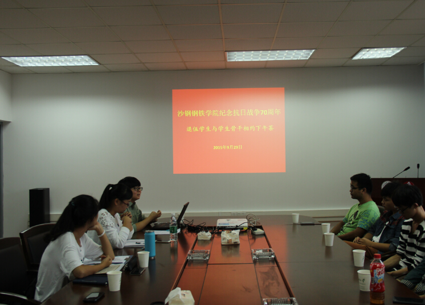 9月29日下午3点,沙钢钢铁学院纪念抗日战争胜利70周年暨退伍学生与学生骨干相约下午茶活动在工科楼704会议室举行。特邀2012级刚从北京退伍归来的程心仪作为嘉宾,学生党支部书记郁佳莉老师主持本次活动。我院全体党员、入党积极分子和学生骨干参加了本次活动。