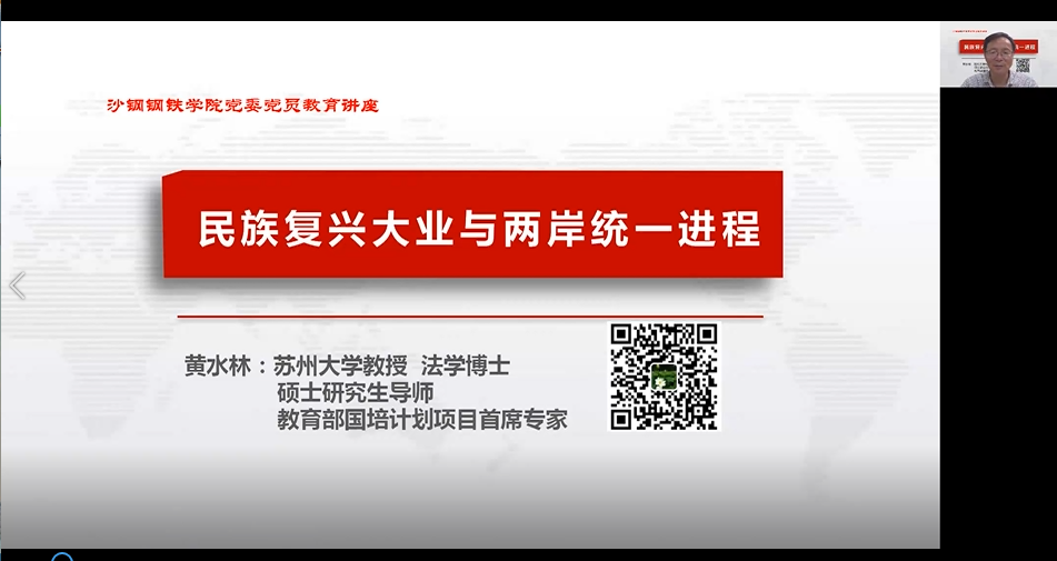 为进一步引导全体学生党员牢记民族复兴、祖国统一的历史大势与中华民族伟大复兴的中国梦,2022年6月8日晚,沙钢钢铁学院邀请苏州大学保卫处黄水林教授作了主题为《民族复兴大业与两岸统一进程》的党课,研究生辅导员成苗,全体学生党员聆听了党课。党课由学院党委书记沈云彩主持。