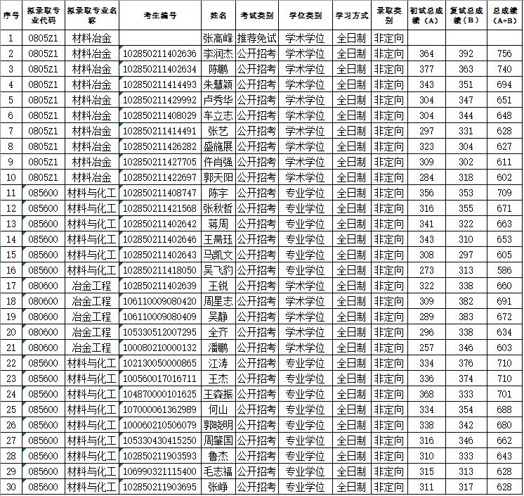 沙钢钢铁学院2020年硕士研究生拟录取名单公示