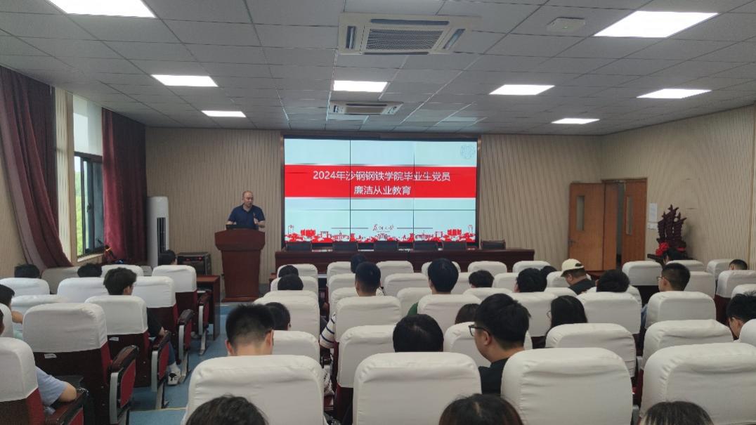 为进一步加强毕业生党员党性教育和廉洁自律意识,切实做好毕业生党员离校教育,厚植理想信念和爱党情怀,引导毕业生党员树立正确的职业价值观,扣好廉洁从业第一粒扣子,2024年6月5日下午,沙钢学院党委召开2024届毕业生党员廉洁从业教育暨警示教育专题会,学院党委副书记、副院长、纪检委员徐海洋为2024届毕业生做专题教育,学院党委书记沈云彩,全体辅导员,全体发展对象、2024届研究生、本科生党员参加学习。