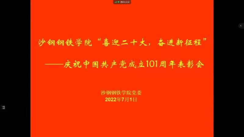 为庆祝中国共产党成立101周年,喜迎党的二十大,弘扬伟大建党精神,2022年7月1日下午2点,沙钢钢铁学院党委举办“喜迎二十大,奋进新征程”——庆祝中国共产党成立101周年表彰会,对本年度优秀共产党员、优秀党务工作者和先进基层党组织予以表彰。学院全体党员参加线上会议,会议由学院党委副书记徐海洋主持。