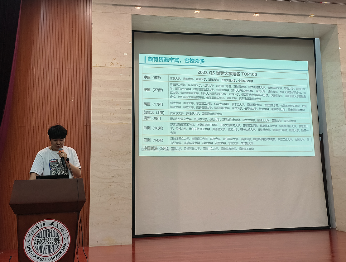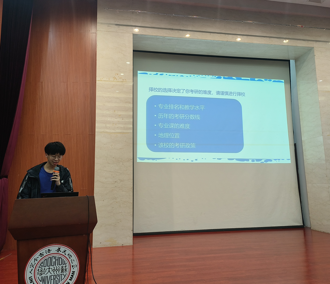 范仁杰申请了美国波士顿大学留学,他向大家介绍了美国、英国、加拿大等国学校和社会就业情况及留学的花费。重点强调了出国留学绩点的以及英语成绩的重要性。除了这些硬指标,科研和实习软实力也非常重要。他鼓励学弟学妹们积极参加知名科学院的科研项目,在大一,大二的暑期去实习和社会实践,勇敢的人先享受世界。