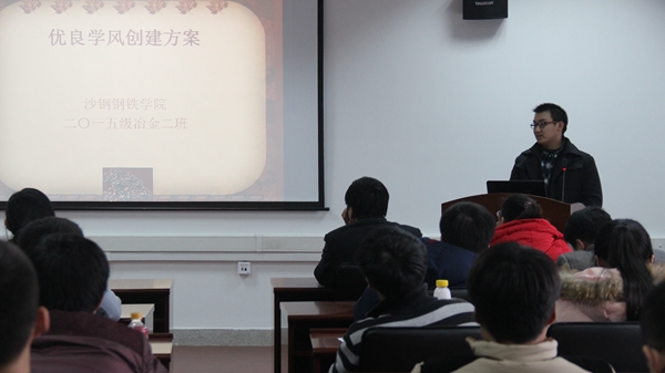 各班班长依次向大家汇报了本班级的特色创建方案。2013级冶金班班长郝月莹以“奔跑”为主题,从班级风采、创建方案、预期结果三个方面进行了总结,提出建立早起晨读制度、学霸讲堂以及成立科研小组的新方案促进学风建设。郝月莹表示,一个人的聪明有限,众人的智慧无穷,在全班级努力下,一定能够营造优良学风。2013级金属材料班班长曾盼林就班级基本情况、班级创建基本举措、班级创建目标、优良学风班创建特色四个方面展开叙述。尤为形象的是,该班将举措概括为“四把火”、“四强化”,并期望通过“高强度”和“高韧性”的“热工艺处理”后,同学们在学习方面能达到像高品质钢一样的性能,体现了班级学风创建的专业色彩,博得大家的一致好评。2014级冶金工程班班长谢仲豪以班级口号“文明高雅,乐学善思”切入,对争创优良学风班的集体成绩进行分析总结提出建立点名签到制度、学习帮扶小组、班级竞赛制度。2014级金属班班长葛斌就班级概况、风采显示、创建方案以及目标四个方面进行了详细的汇报。在学习上,该班提出要实行基本要求严格化、课程学习合作化以及技能拓新常规化等,最后他表示沙钢正年轻,应共同努力。2015级冶金1班班长杨艳从学习、生活、科研以及目标四个方面进行阐述。创建举措中,两人一组、小集体竞争、全员总结等为该班亮点。值得一提的是,“跟踪目标主题班会”为该班的一大特色,杨艳将近期一次主题班会的成果简要展示给大家。她表示,成绩是硬条件,但优良学风的建设不仅表现在学习,亦体现在生活,寓教于乐,才能学得更好。2015冶金2班班长陈良渊由刚入学的军训引入,为大家展示了班级的活动与状态。他将梦想与班级建设紧密联系在一起,并总结汇报了班级考勤制度以及班级书香活动等。书香一月,寄情万里,以活动迸发青春,以目标激发动力,陈良渊表示,定会带领班级努力,争创优良学风班。2015级金属材料工程班班长吴晓洋为大家展示了自开学以来班级参加的各项活动与比赛以及获得的荣誉,并提出“博学笃行,自强不息,厚德载物,强我金属”的班级口号。在班级建设方面,该班提出晚自习考勤制度、“学霸来帮你”活动、“约跑”计划以及班级定期总结,并设立了特殊的“o2o”模式,希望通过一系列强有力方案的实施,将班级建设的更好更强。