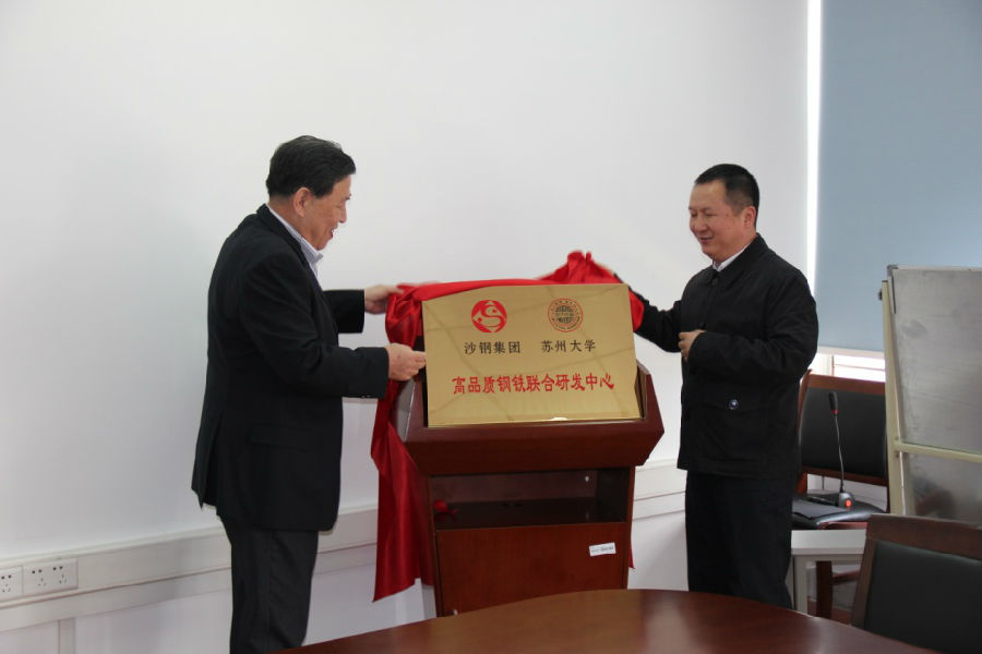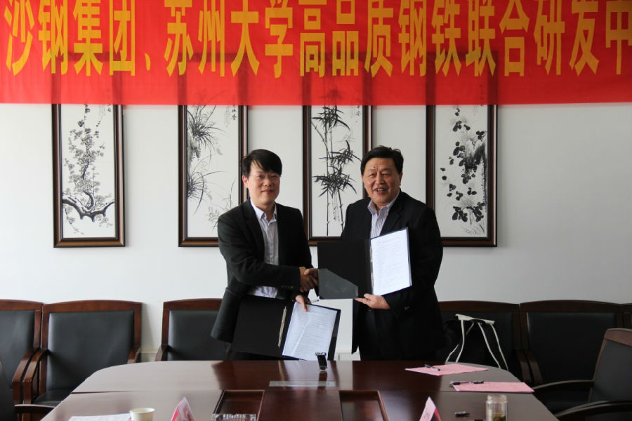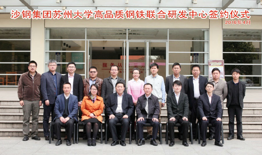 2016年4月9日上午,苏州大学沙钢钢铁学院与沙钢集团研究院合作共建“高品质钢铁联合研发中心”签约仪式在沙钢钢铁学院举行,沙钢集团常务执行董事、党委常务副书记陈晓东、江苏沙钢研究院常务副院长麻晗、院长助理胡显军、沙钢钢铁学院党委书记宋清华、副院长钟胜奎及学院教师代表参加了协议签订仪式。