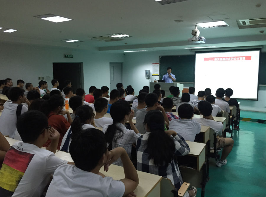周科长用鲜活的、现实的例子引出了新生普遍存在的安全盲区,他举了几例发生在身边的安全事件,进一步给新生敲响警钟,从网络购物、电信诈骗、面对面诈骗等不同角度提出新生所要注意和加强防范之处。他从校园盗窃案件初始动机、目标物件、高发区域、高发时间、作案手段进行分析,他指出盗窃主要发生在宿舍、浴室等地方,叮嘱新生出门一定要注意要注意门窗关闭、严防陌生人进出宿舍、去浴室不带手机等,时刻保持高度警惕。
