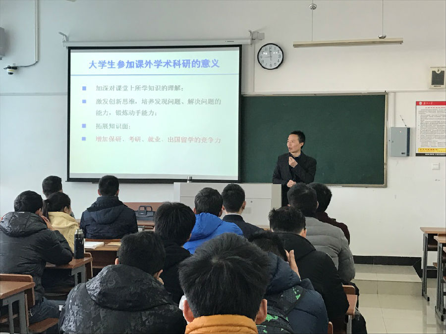 钟胜奎教授首先讲了课外学术科研的意义,他指出,参与科研项目不仅仅能加深学生对科研的理解,更好地将课内知识结合起来,而且在做科研的过程中能激发创新性思维,提高学生发现问题、解决问题的能力,同时锻炼动手能力,拓展知识面以及增加保研、考研、就业、出国留学的竞争力,积极参与到科研项目中去将有利于自身的发展。之后,钟胜奎教授介绍了申请科研项目的类别,学校科研项目主要有大学生课外学术科研基金项目,大学生创新创业训练计划项目,莙政基金,“挑战杯”大学生课外学术科技作品竞赛和“苏大天宫杯”大学生创业计划竞赛。