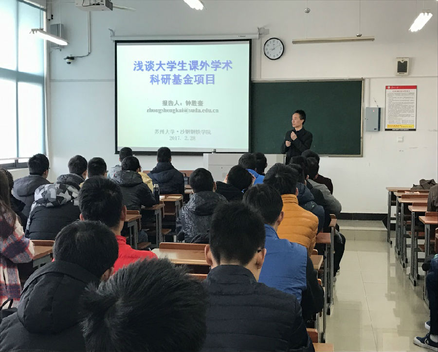 学院高度重视大学生实践创新能力和科研意识的培养。开学伊始,学院副院长钟胜奎教授针对15级同学进行了科研宣讲会,让大家对科研项目有了更多的认识,为大家解除了心中对于科研的疑惑,同时也激发了大家对于科研的热情,鼓励大家积极的投身到科研中去。