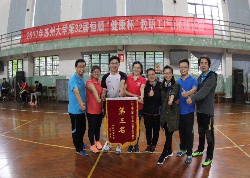 10月17日至10月29日,苏州大学2017年第32届教职工气排球比赛在北校区体育馆隆重举行。沙钢钢铁学院领导对此次活动给予了高度重视, 学院教职工报名踊跃。在宋清华书记的关怀下,学院组织了一只球队参加此次比赛。在学院领导的关心下,队员们赛前积极备战。比赛开始后,队员们团结一致,齐心协力,全身心地投入比赛中,发挥出自己的最佳技术水平。在小组赛中,学院球队位列第一,成功出线。在队员们的努力之下,球队成功闯入半决赛,挺进四强,最终获得第三名的好成绩。