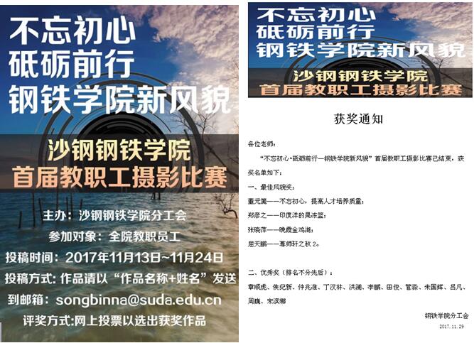 为喜迎党的十九大胜利召开,展现沙钢钢铁学院教职工生活中的人文精神之美,形成弘扬社会主义核心价值观的校园氛围,沙钢钢铁学院分工会近日举办了“不忘初心▪砥砺前行—钢铁学院新风貌”首届教职工摄影比赛。