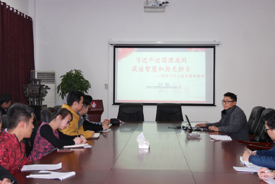 孔老师对党的十九大会议的精神进行解读,他指出,党的十九大会议是在全面建成小康社会决胜阶段、中国特色社会主义进入新时代的关键时期召开的一次十分重要的大会。十九大给我们带来了三个“新”,新时代,新思想,新的基本方略。孔川老师强调了以下三点:一,中国特色社会主义进入新时代是我国发展新的历史方位,意味着中国的特色社会主义道路在不断发展,会发生机活力,有着光明的前景;二,习近平新时代中国特色社会主义思想是党和人民实践经验和集体智慧的结晶,中国特色社会主义理论体系的重要组成部分,是全党全国人民为实现中华民族伟大复兴而奋斗的行动指南;三,十四条基本方略以党的工作作为中心,端正党的工作态度,以党的工作为中国人民谋幸福,为中华民族谋复兴,这就是我们中国共产党人的初心和使命。
