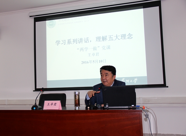 2016年5月10日下午,校党委书记王卓君赴沙钢钢铁学院,以“学习系列讲话,理解五大理念”为题为学院全体师生党员作专题党课。