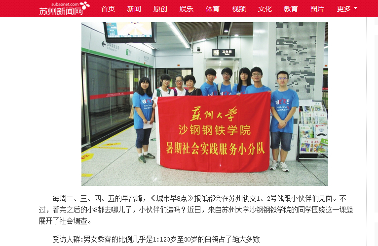 围绕这个问题,苏州大学沙钢钢铁学院“创建苏州地下阅览室”暑期社会实践团队的成员们展开了一系列全面的走访和调查,通过视频拍摄、问卷调查、模拟创建苏州地下阅览室等一系列活动的开展,团队成员们了解到:由于报纸的回收架摆放位置不合理,乘客们忽略了报纸的回收,大部分将免费报纸带出了地铁站,导致其他时间段的乘客无法阅读到报纸,这无疑造成了免费报纸的大量流失,报纸的价值也没有得到充分的利用。调查结果显示,大部分乘客不知道报纸回收架在哪里,如果将报纸回收架安置在站台电梯的出口,76%的乘客愿意将报纸放回回收架,方便其他时间段的乘客阅读,认为地铁报精彩有趣,回收分享更环保。