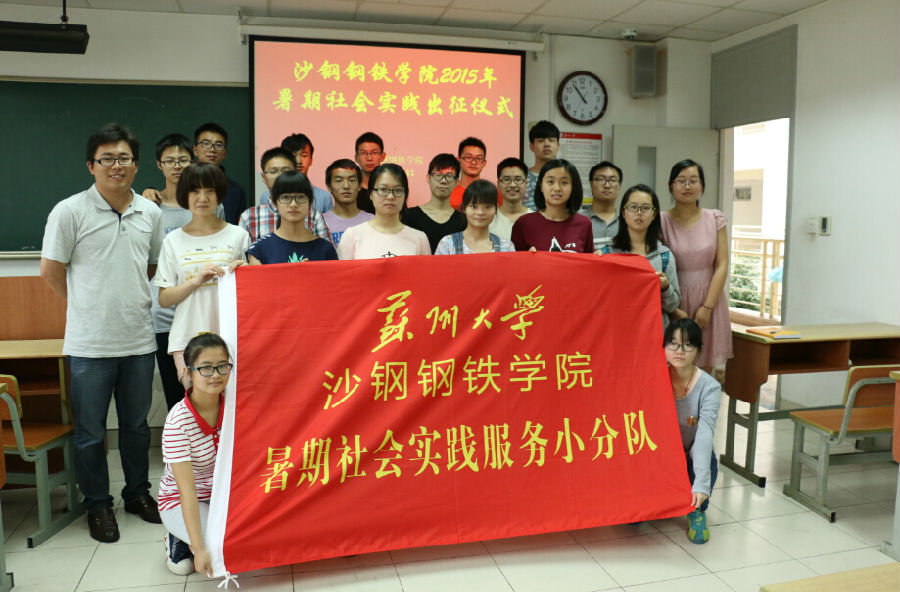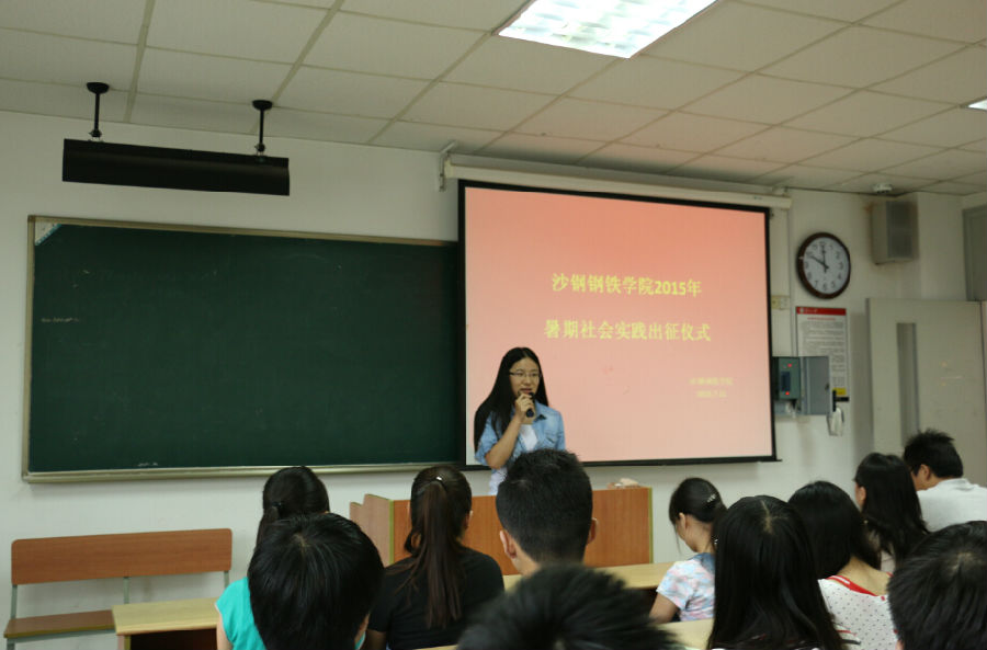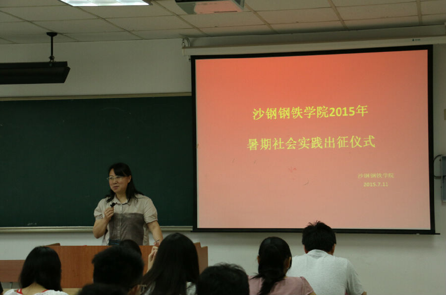 2015年7月11日上午10点,沙钢钢铁学院2015年暑期社会实践出征仪式在工科楼205举行,出席仪式的有院党委书记宋清华老师,院学工办主任孔川老师,以及各个暑期社会实践团队的成员。仪式由郁佳莉老师主持。