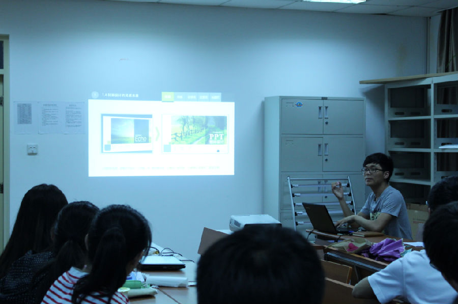 潘在飞建议大家以后在准备汇报时注意要保存两个版本,一个是在自己电脑上制作的版本,另一个是Word97-2003,以防汇报时自己版本中的特有效果在其他电脑上无法呈现。之后,潘在飞带领大家观看了一个妙趣横生的动画,让大家充分感受到PPT的魅力所在,大家看的津津有味,有的同学一起讨论PPT的精妙之处。