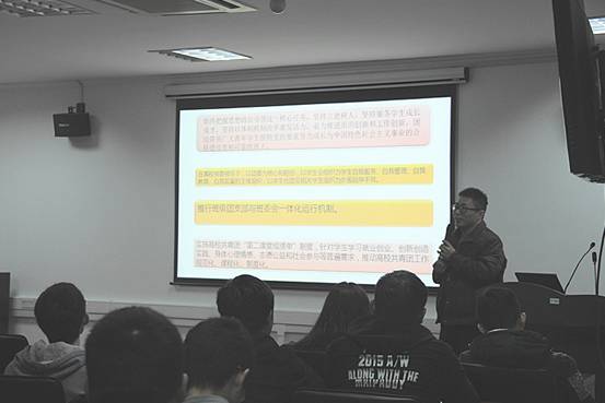 开幕式结束后,孔川老师应邀开展了题目为《解读习近平治国理政的思想密码》的主题讲座。孔川老师以团的职能是引导青年、服务青年、组织青年、维护青少年合法权益为切入点。并根据中央党的群团工作会议精神指出我院要加强团的政治性、先进性、群众性。努力贯彻落实中央党的群团会议精神,推动共青团改革创新。始终把握思想政治引领这一核心任务,坚持立德树人,坚持服务学生成长成才,坚持以体制机制改革激发活力,着力推进组织创新和工作创新。他强强调推行班级团支书与班委会一体化运行机制,并号召大家学习马克思的伟大精神,培养自身能力。最后孔川老师提出了团干部的新要求、新方向是深厚的理论功底,扎实的专业基础、超群的人格魅力、无悔的奉献精神。团干部要起到良好的带头模范作用,在同学中要产生积极影响。