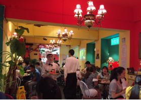 这家店常年门口都排起长队,为了这次调查报告,终于下定决心中午打车过来拔草。餐厅墙面主要是红色,再用部分绿色、黄色进行撞色,视觉上非常明快时尚。欧式的灯具,碎花的沙发以及入户等待区和后花园餐区大面积的植被景观,整体感觉又特别田园。