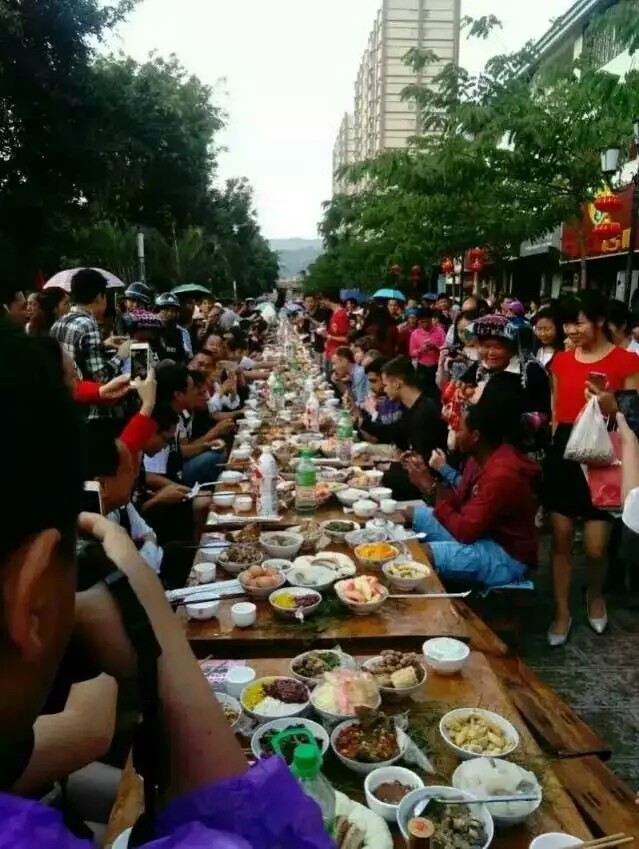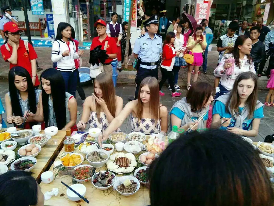 此外,成员们还了解到墨江县是中国哈尼族的主要聚居地之一,哈尼族一直流传着吃百家宴的习俗,如今这一习俗已经成为当地各民族共同的盛宴——长街宴。每年的长街宴,都会吸引来自不同国家的游客参与。今年的长街宴,更是吸引了来自俄罗斯、印度等11个国家的国外双胞胎25对,明星双胞胎13对,本地双胞胎1000余对,以及外地游客参加。长街宴现场,980张方桌沿民俗步行街摆成一排,场面壮观。宴会菜品丰富,每桌均是10余个菜,有油淋土鸡、墨江泡皮、牛肉汤锅和萝卜排骨等,荤素搭配,同时还配有饮料酒水。
