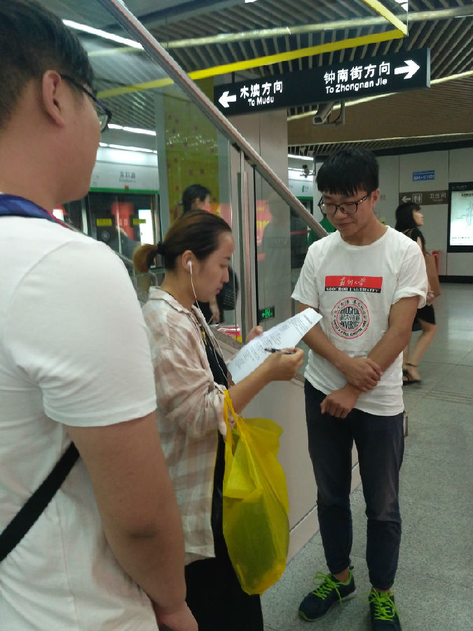 今天我们调查小分队深入各个地铁站,对来往市民进行了详细的问卷调查。一大早,我们小分队的五个人坐上公交车从学校出发直奔东环路地铁站,主要对市民进行了问卷调查;之后又乘坐地铁来到相门地铁站,对在校大学生,以及附近居民进行问卷调查。下午我们来到旅游景区附近对外地游客进行了调查。本次调查主要围绕园林保护现状以及园林文化开发等问题,确实了解了大众对园林文化的认识。