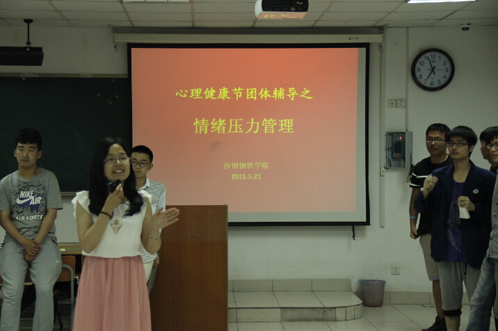 5月21日,沙钢钢铁学院心理健康节系列活动之团体辅导在工科楼210举行,活动围绕“情绪压力管理”这一主题展开。苏州大学教育学院心理学系研一学生许劼应邀担任活动的主持人。