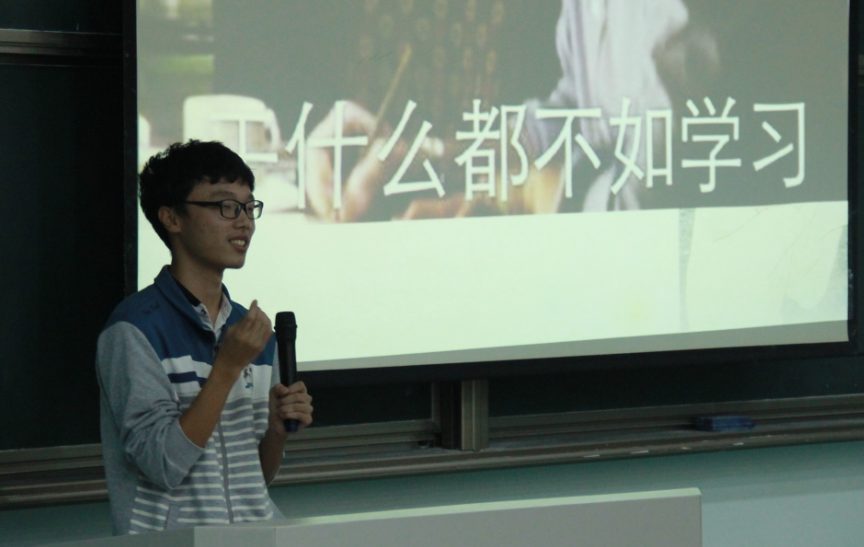 2013级金属材料专业肖震东同学保研至本校本专业。他和大家回顾了自己漫无目标的大一生活,也曾陷入熬夜打游戏的堕落。他特别强调了自觉的重要性,大多数人都沉迷于娱乐游戏,始终无法战胜内心的惰性。肖震东还是个漫画迷,也是个十足的文艺青年,他向大家展示了自己的漫画作品,引起了在场同学的阵阵掌声。最后他指出我们就像漫画里的表演家,即使现在的观众只有我们自己,但是我相信未来我台下即将是座无虚席,只要我们坚持做到最好,我们一定会走得更远,看得更高,拥有更好。