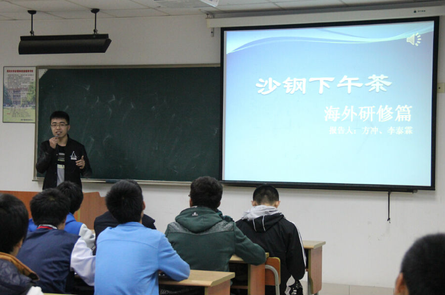 2015年11月9日晚6点30分,沙钢钢铁学院沙钢下午茶之海外研修专场活动在工科楼206教室举行。我院2013级冶金工程专业方冲同学作为特邀嘉宾出席活动。