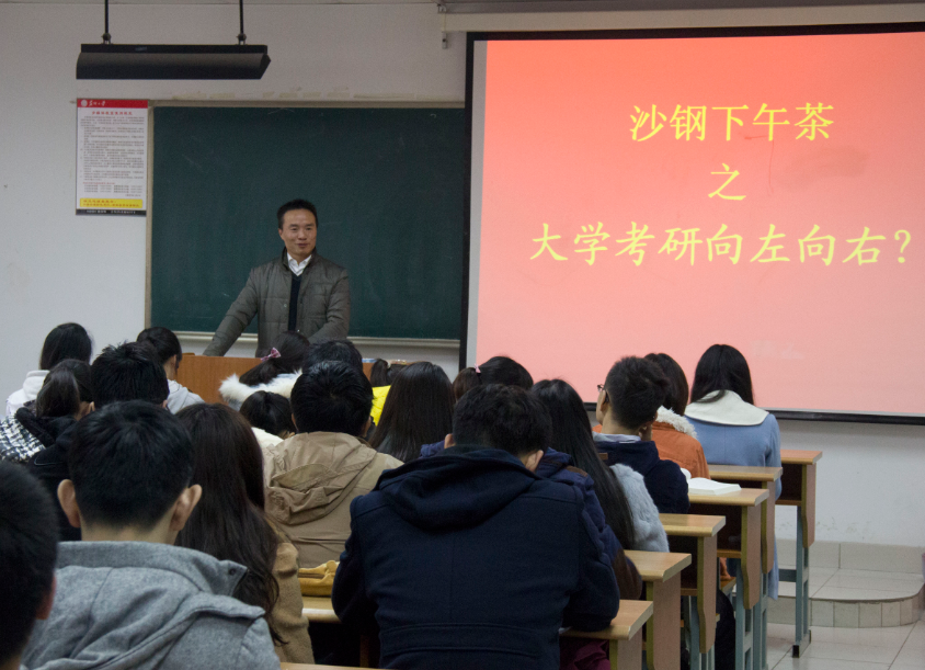 2015年12月9日下午1:30,沙钢下午茶之大学考研主题讲座在工科楼409举行。副院长钟胜奎教授应邀担任主讲嘉宾对沙钢学子的考研和科研工作进行指导。