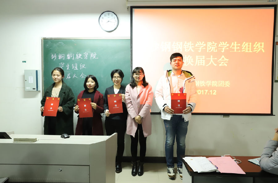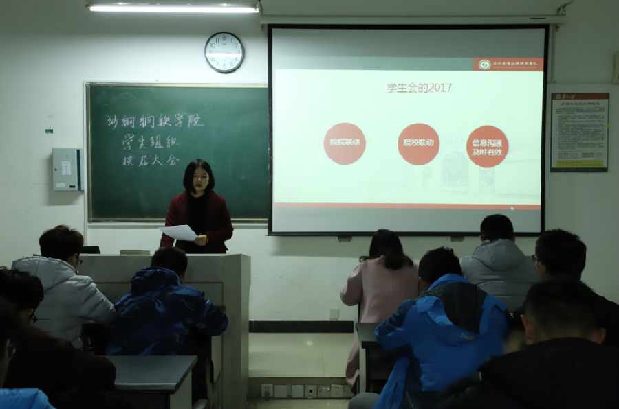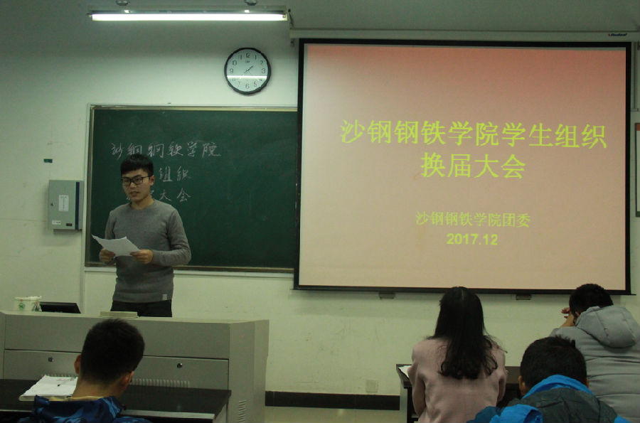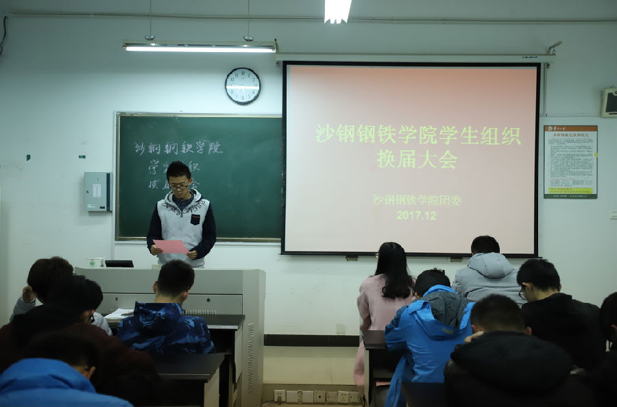 2017年12月28号晚上,沙钢钢铁学院学生组织换届大会于阳澄湖校区1C302隆重举行。院团委副书记郁佳莉老师出席此次会议,各学生组织负责人、部长及全体干事与会。