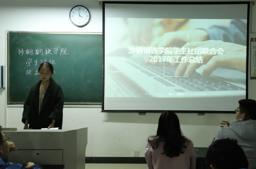 首先各学生组织负责人汇报本年度的工作总结。李瑶汇报了团委2017年度的工作。她从部门设置,规章制度,活动展示,总结寄语四个方面介绍了团委的工作。团委内部分为办公室,组织部,活动部,生活部四个部门,其紧密联系,发挥着各自的作用,有着严格的规章制度。除此之外,团委也承办了新生英语短剧大赛、宿舍文化节等活动,丰富了同学们的课余生活。学生会主席蔡晓娅从日常管理、特色活动、创新工作三个方面讲述了学生会的工作。2014年沙钢书屋正式启动,而在学生会的管理下,书屋也开展了一系列的活动,包括新生捐书、毕业季图书漂流活动。而在学生会各负责人的带领下,学生会也愈加趋于正规化、完备化。社联主席喻桢璐从社联概况、社团篇、社联篇和展望篇四个方面总结了社联的相关工作。然后,科协理事长李超从科协内部培养、活动策划组织篇、科研学术实践篇、卓越成绩展示篇四个方面展现了院科协的风采。他们秉承着科协一家亲的理念,力求为广大学生服务。