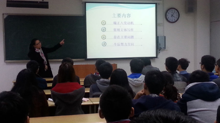宋清华老师首先提出了入党动机问题。作为新时代的大学生,应该首先端正入党动机,树立远大理想,并结合典型人物做了诠释。鼓励同学们要志存高远,争当先锋!同时,针对2014级积极要求进步,有入党志愿的同学,如何写入党申请书、如何写思想汇报等从书写格式、书写内容、书写形式、书写字数等方面做了详细指导。