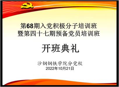 2022年10月21日,沙钢钢铁学院第68期入党积极分子培训暨第47期预备党员培训班开班典礼在腾讯会议线上召开。学院党委书记沈云彩,院党委副书记、副院长徐海洋和全体学员参加会议。会议由研究生辅导员成苗主持。