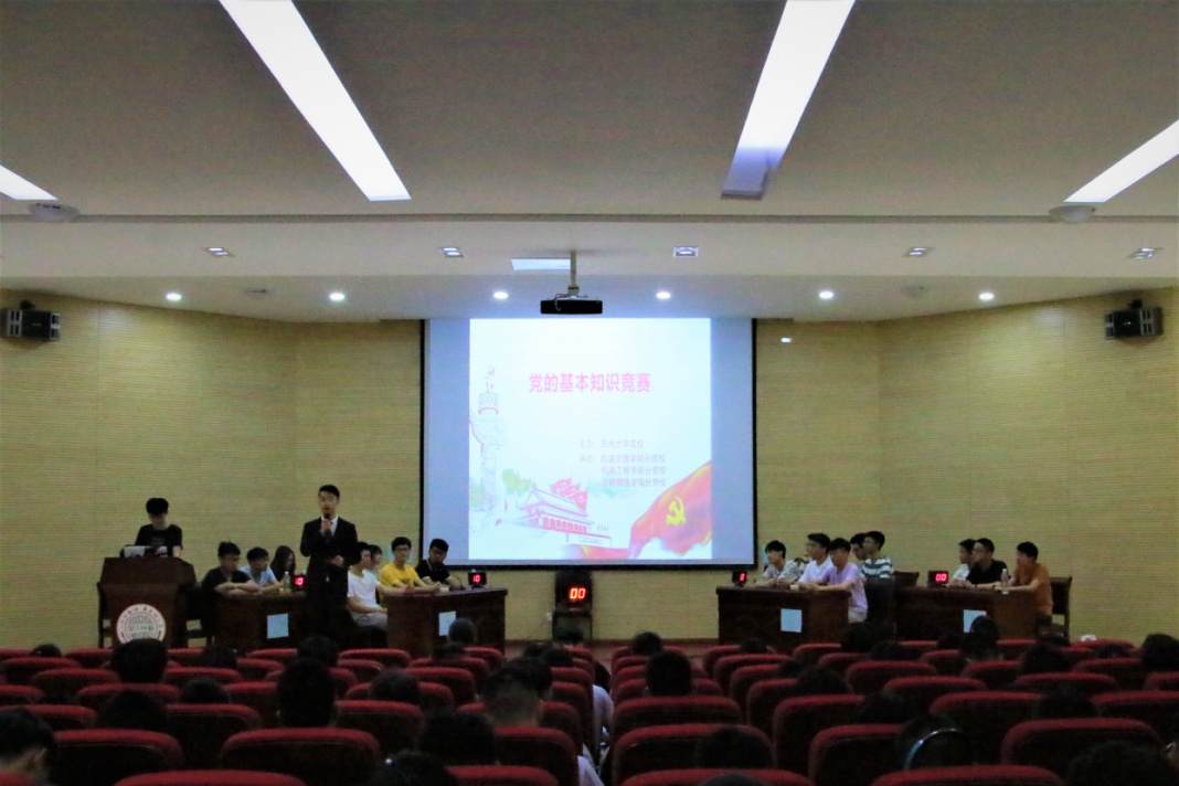 为了进一步激发同学们对党的基本知识的学习热情,丰富党校学习的形式,2019年5月23日晚6:30,一场精彩而激烈的党的基本知识竞赛在苏州大学阳澄湖校区开展。本次活动由轨道交通学院分党校、机电工程学院分党校以及沙钢钢铁学院分党校联合举办。三家学院分别派两组代表,每组三人组队参赛,其他党员、入党积极分子和部分群众代表现场观摩学习。机电工程学院分党校秘书吕畅达老师参加活动。