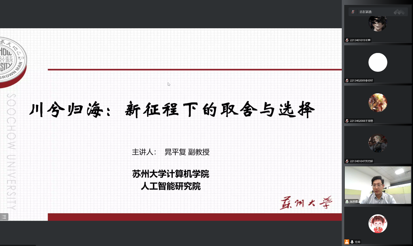 11月23日晚,计算机科学与技术学院人工智能研究院海归青年学者晁平复副教授为我院2022级全体新生开展了一场以“川兮归海:新征程下的取舍与选择”为主题的讲座。考虑到疫情防控安全,本次讲座以线上会议的方式举办。讲座由2022级辅导员郁佳莉主持。