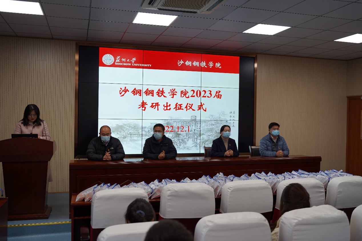 2022年12月1日下午2点,沙钢钢铁学院在冶金楼3102举行“沙钢钢铁学院2023届考研出征仪式”,帮助2023届考研学子坚定目标、增强考研信心。学院党委书记沈云彩,副院长王德永,副院长丁汉林,党委副书记、副院长徐海洋,全体考研同学参加了出征仪式。出征仪式由辅导员成苗主持。