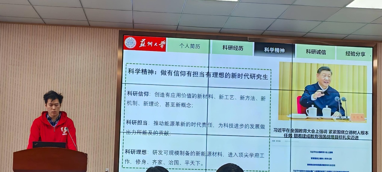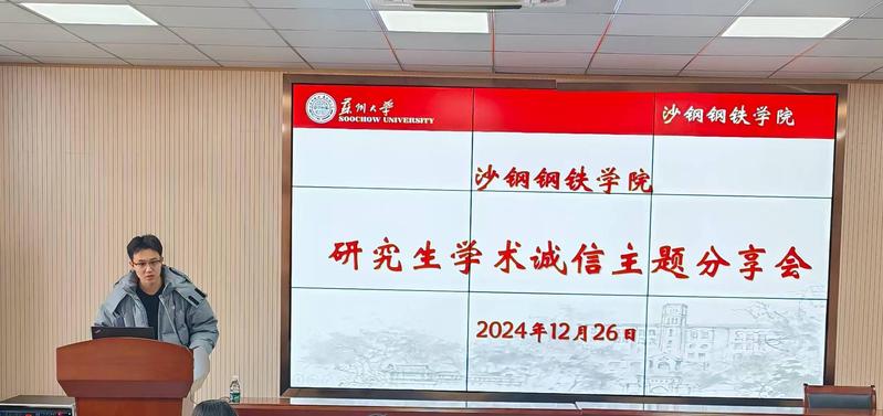 为进一步自觉践行、大力弘扬新时代科学家精神,加强作风和学风建设,严守科研诚信,发挥榜样引领示范作用,营造风清气正的科研环境,2024年12月26日下午,沙钢钢铁学院在冶金楼3102开展研究生学术诚信主题教育活动。研究生辅导员成苗、在校研究生参加本次活动。活动由2024级研究生饶开主持。本次活动邀请了2024年国家奖学金获得者周星志(2022级博士)、魏珂正(2022级硕士)、费文斌(2022级硕士)前来分享经验。
